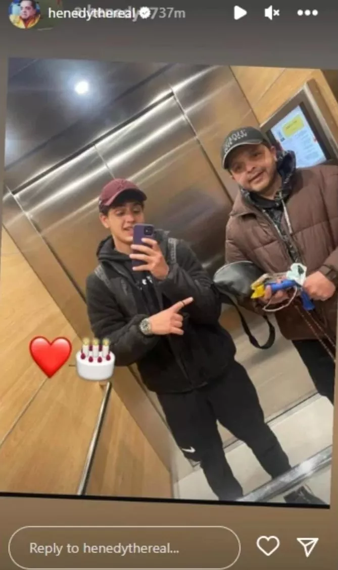 وظهر محمد هنيدي عبر خاصية “الاستوري”، في صورة سيلفي أمام المرآة برفقه ابنه، وعلّق هنيدي علي الصورة واضعًا شكل القلب مع شكل تورتة عيد ميلاد.