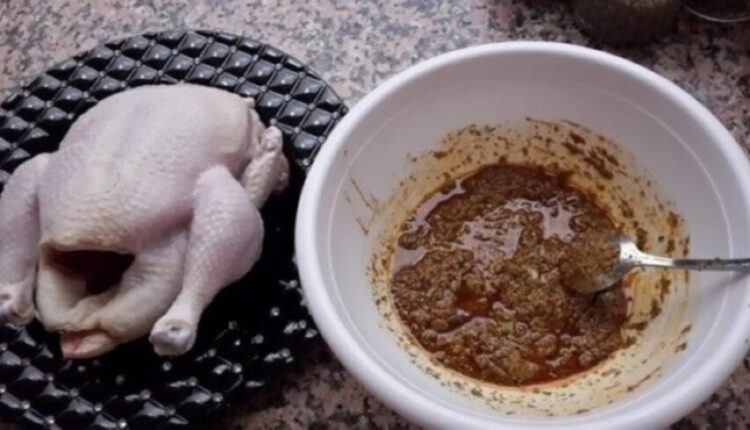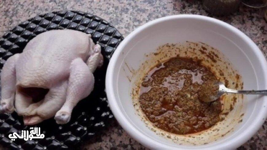قومي سيدتي بعد غسل الدجاج بخلط هذه المكونات التي ستعتمدين عليها في تتبيل الدجاج على طريقة المحترفات في الطبخ حيث ستحتاجين إلى حبة ليمون كبيرة وأربعة فصوص ثوم و قرن فلفل أخضر حلو ملعقة صغيرة أوراق إكليل الجبل و نصف ملعقة صغير كركم و ملعقة طعام ملح و ملعقة كبيرة بابريكا، نصف ملعقة صغيرة فلفل أسود، ثلاث ورقات غار حبتا هيل ملعقة كبيرة زيت زيتون و نصف ملعقة كبيرة بهار مشكل ، ثم اعتمدي القليل من الماء المعدني لخلط التتبيلة التي ستقومين بتجهيزها وتركها مدة 30 دقيقة قبل تتبيل الدجاجة بها وبعد التتبيل ضعي الدجاج المتبل في إناء واحكمي إغلاقه بالبلاستيك الغذائي واتركيه ليلة كاملة لطهي في اليوم الموالي.