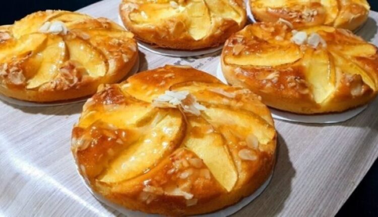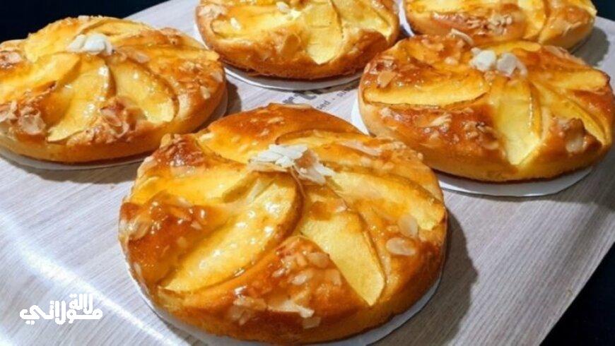 القياس بعلبة الياغورت 110 غ المكونات بيضتين علبة ياغورت طبيعي 110 غ علبة سكر علبة زيت 10 غ خميرة الحلويات فانيلا مبشور البرتقال علبتين ونصف دقيق ابيض للتزيين تفاح مربى مشمش