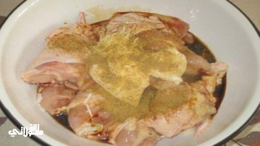 بعد أن تغسلي الدجاج بطريقتك المعتادة قومي بنقعه في كمية من المياه التي تضيفين لها عصير الليمون مع شرائح مقطعة أيضا من الليمون ثم ملعقتين من الخل ثم أضيفي له حبات من الابزار وورق سيدنا موسى ثم المكون الإضافي ملعقة من الزنجبيل المطحون هذا يزيد الدجاج مذاقا لا قاوم .