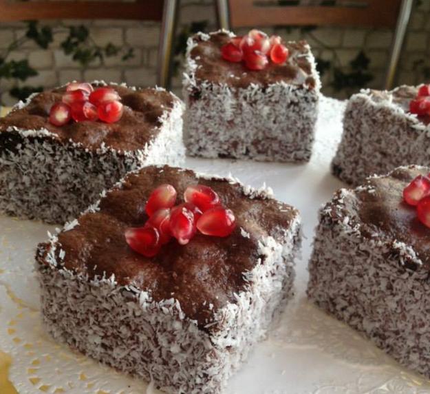 وهنا ممكن نقسم الكيكة قبل قطعها مربعات نصفين وتحشى بمرية مشمش أو أى كريمة حسب الرغبة،ثم تقطع مربعات،وتغطى بصوص الشوكولاتة وجوز الهند