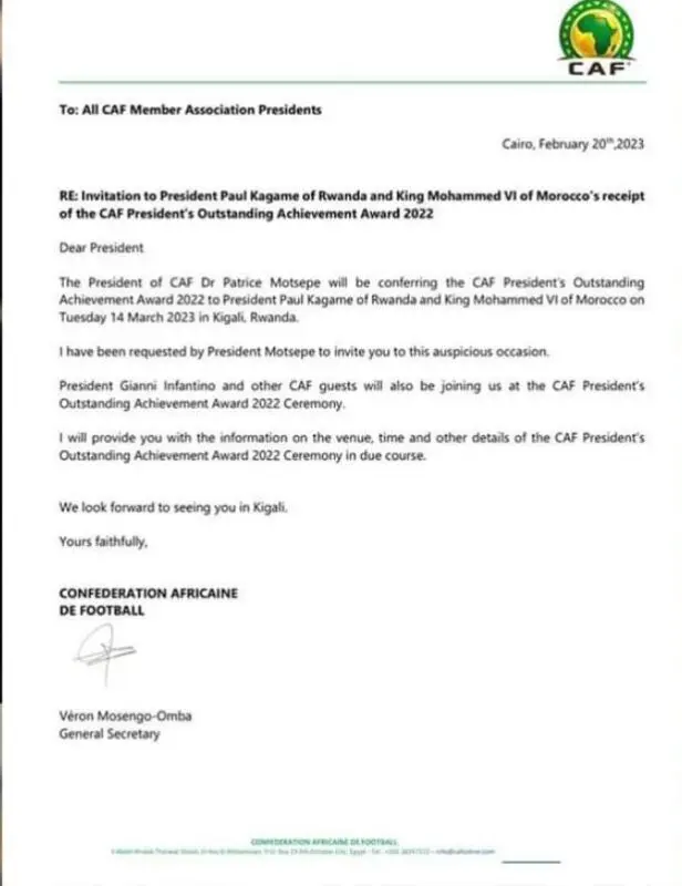 وأشارت وثيقة متداولة للاتحاد الافريقي لكرة القدم أن الرئيس الرواندي بول كاغامي. هو من سيكلف بتسليم “جائزة الإنجاز المتميز 2022” للملك محمد السادس.