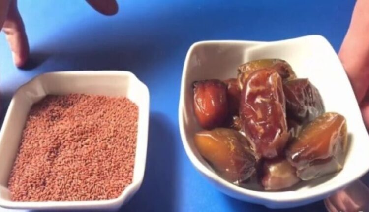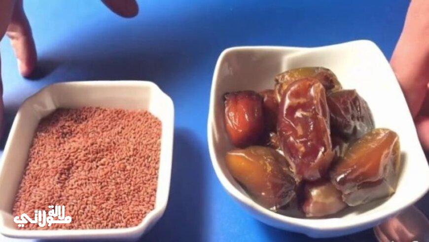 المكونات : كمية من حب الرشاد + كمية من حبوب السانوج + كمية من التمر