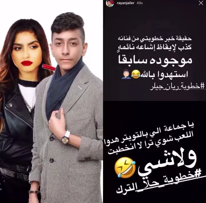 ويبدو أن الخطيب المزعوم كان الناشط الاجتماعي على السوشيال ميديا السعودي ريان جيلر صاحب الـ20 عامًا، الذي علق بدوره “حقيقة خبر خطوبتي من فنانة كذب لايقاظ شائعة نائمة موجودة سابقاً، استهدوا بالله”.