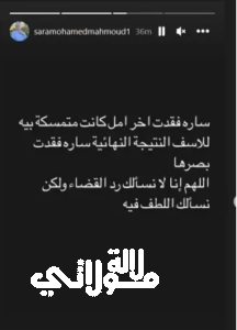وكتبت صفحة سارة عبر حسابها بموقع انستغرام: سارة فقدت آخر أمل كانت متمسكة به للأسف النتيجة النهائية سارة فقدت بصرها اللهم لا نسألك رد القضاء ولكن نسألك اللطف فيه.