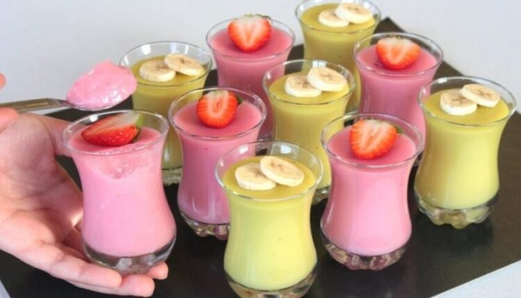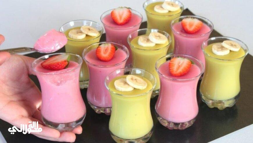 تحلية سهلة وسريعة نصف لتر حليب ×2 كيس فلان ( بودينغ ) بالفراولة علبة ياغورت بالفراولة كيس فلان ( بودينغ ) بالموز علبة ياغورت بالموز 3 ملاعق كبيرة سكر ×2 2 ملاعق كبيرة دقيق أبيض.