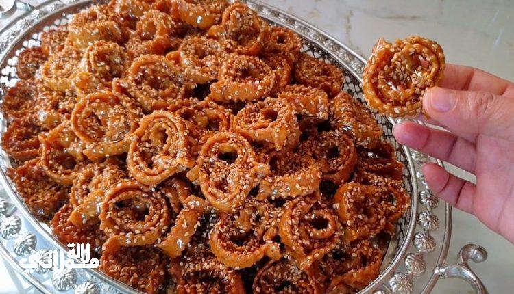 مكوناة العجينة كيلو دقيق ابيض نوع جيد 150غ زنجلان مايعادل 2 كؤوس عنبة معلقة كبيرة نافع مطحون معلقة كبيرة قرفة معلقة صغيرة خميرة حلويات راس ملعقة صغيرة ملح القليل من الكوزة 100غ زبدة مذابة مايعادل كأس قل ربع 100غ خليط زيت زيتون وزيت المائدة مايعادل كأس الى ربع كأس ماء زهر مايعادل 150غ كأس ماء دافي مايعادل 150غ ربع كأس خل زعفران حر او ممكن تعويضه بضامة الزعفران.