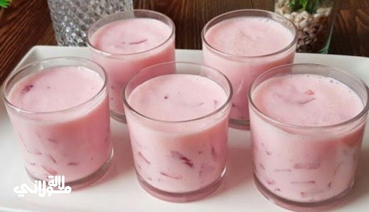 من مطبخ قناة كوكتيل شانيل / المكونات:نصف لتر حليب+فلان بنكهة الفراولة+ملعقة كبيرة سكر+علبة جبن طري بالفراولة+8 حبات فراولة