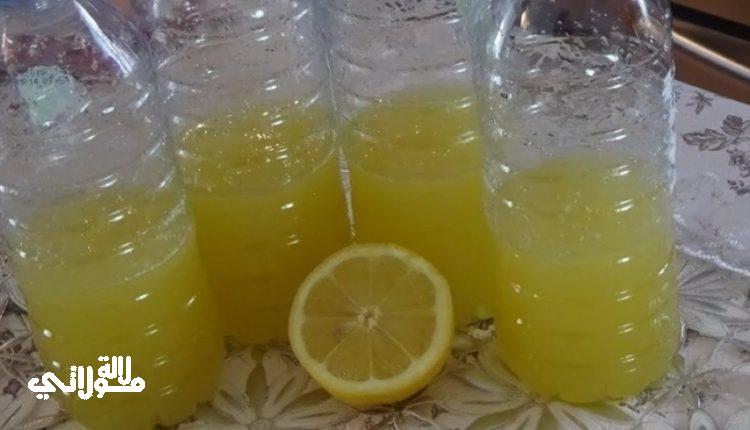 يمكنك سيدتي أن تعتمدي كيلوغرام من الليمون الحامض لتر من الماء و سكر، حسب الرغبة ثم قومي بعصر حبات الليمون الحامض. وضعي عصير الليمون الحامض في وعاء الخلاط الكهربائي، ثم إضافة الماء، والسكر خلط المكونات جيدا حتى تمتزج ثم ضعيها على النار لمدة 15 دقيقة ثم قومي بوضع عصير الليمون في قنينة زجاجية داخل الثلاجة إلى حين الاستعمال.