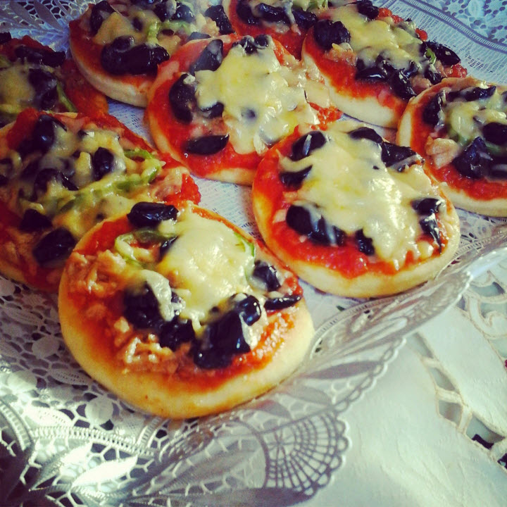 صلصة الطماطم تونة مصفاة من الزيت زيتون اسود منزوع النوى ومقطع صغير فلفل اخضر مقطع دوائر جبن مجكوك