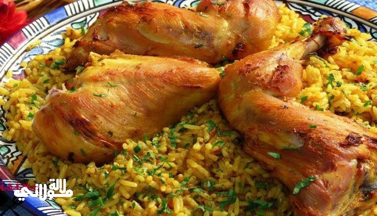 مكونات الطبق الرئيسي دجاجة بلدية خمس حبات فلفل احمر نصف الكمية نستعملها في الصلصة والباقي في السلطة الدافئة اربع فصوص ثوم نصف ملعقة كمون ملعقة زنجبيل ملح ملعقة الفلافل الخمس أو ملعقتين قزبر يابس ملعقة فلفل أحمر قزبر ومعدنوس الليمون المخلل(حامض المصير) ورق الرند أو الغار أو موسى كيلوا الى ربع ارز زيت زيتون.