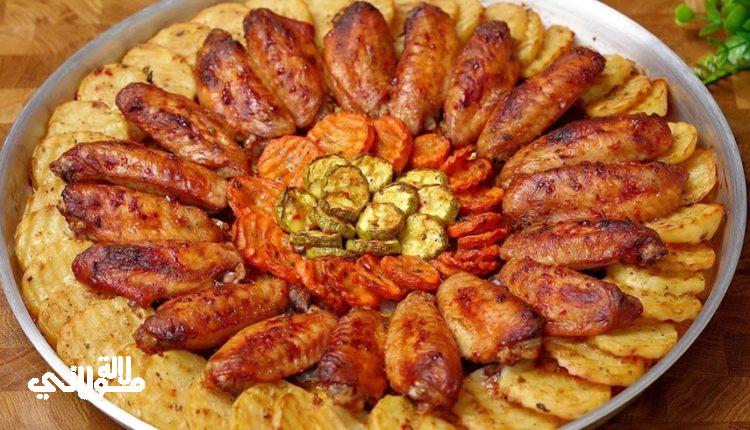 أجنحة الدجاج فب الفرن المكونات اجنحة دجاج الكمية حسب الرغبة 3 ملعقة كبيرة زبادي ملح وفلفل اسود 1 ملعقة كبيرة بابريكا 1 ملعقة كبيرة ثوم مهروس 1 ملعقة صغيرة زعتر 2 ملعقة كبيرة عصير ليمون 1 فلفل 2 ملعقة كبيرة ماسترد 3 ملعقة كبيرة كاتشب 3 ملعقة كبيرة زيت للخضار 3 ملعقة كبيرة زيت للدجاح بطاطس وجزر وكوسا ربع كوب ماء مغلي 1 كوب بازيلا 1 جزرة مفرومة بصلة متوسطة مفرومة ناعم 100 جرام لحمة مفرومة 2 ملعقة كبيرة زيت 2 ونصف كوب ارز بسمتي منقوع 15 دقيقة ملح 1 ملعقة كبيرة سبع بهارات ورق غار 4 كوب ماء مغلي الملاحظات نشوي الدجاج على حرارة 180 لمدة 75 دقيقة.
