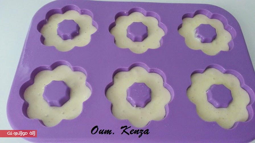 و في الاخير نضيف الزبدة المذابة و نخلط ثم نصب الخليط في قوالب السليكون وندخلهم الفرن