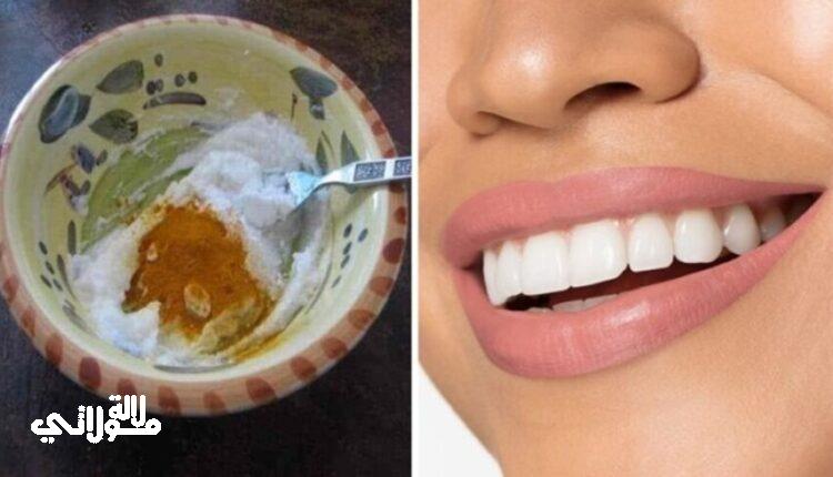 امزجي كل من ملعقة من الملح وملعقة من الكركم وملعقة من جوز الهند وقطرتين من زيت القرنفل مع بعضها البعض جيدا، و قومي بوضعها على فرشاة الأسنان ، وافركي الخليط على أسنانك لمدة 5 دقائق، كرري العملية مرتين في اليوم لمدة أسبوع وستلاحظين النتيجة.