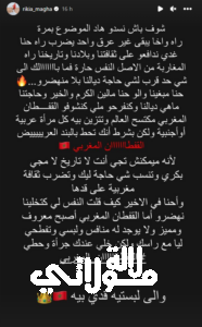 و كتبت رقية “شوف باش نسدو هاد الموضوع بمرة راه واخا يبقى غير عرق واحد يضرب راه حنا غدي ندافعو على ثقافتنا وبلادنا وتاريخنا راه المغاربة من الاصل النفس حارة فما بااااااالك الى شي حد قرب لشي حاجة ديالنا بلا منهضرو..”.