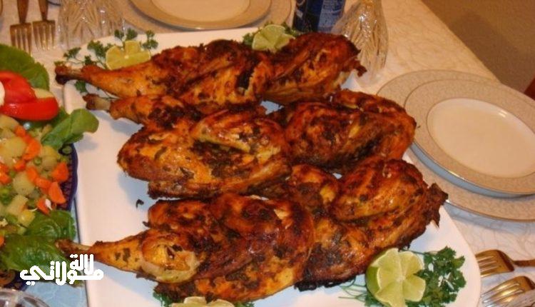 طريقة التحضير غسل الدجاج بالماء بشكل جيد، ثم وضعها واقفة لإزالة السوائل منها. وضع كافة المكونات المتبقية معاً في وعاء عميق. توزيع خليط البهارات على الدجاج وفركها من الداخل والخارج وتغليفها وإدخالها الثلاجة ليلة كاملة. وضع الدجاج في صينية مخصصة لشوي الدجاج، ثم إدخالها الفرن على درجة حرارة مئة وتسعين درجة لمدة ساعة أو حتى تنضج جيداً. وضع الدجاج المشوي في طبق التقديم لتقديمها مع صلصة الثوم والبطاطس المقلية.