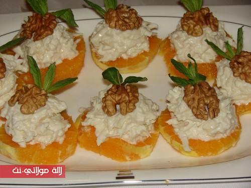 نخلط الزبادى مع المايونيز والفلفل والملح والليمون المكور نخلط ياغورت مع المايونيز والفلفل والملح و الحامض ثم نضع مكور ونخلط نحضر البرتقال ونقشرة ونقطعة لحلقات نضعة فى طبق التقديم ثم نضع علية الخليط