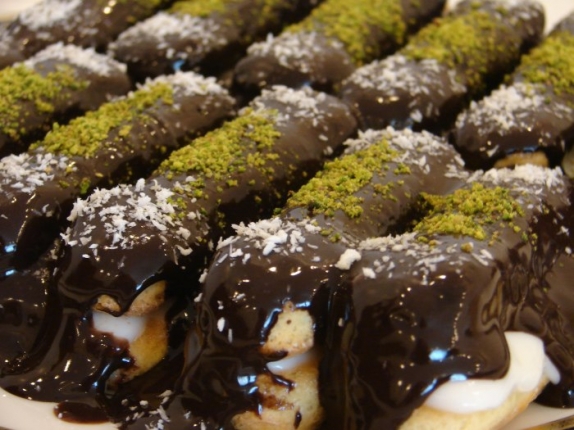 ونقلب حتى يتمازج القوام ثم نضع العسل ثم نضع فى الاخر الفانليا ونقلب جيدا نبدء بوضع صوص الشيكولاتة على البسكولاتة ويزين بالفسدق وجوز الهند