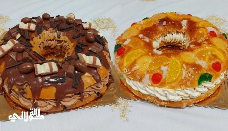 المكونات/ 600 غ دقيق 40غ خميرة الخبز ساشي خميرة الحلوى حبتين بيض 80غ زبدة 150غ سكر ملعقتين زيت ربع ملعقة صغيرة ملح 250مل حليب دافيؤ ملعقة فانيلا للحشوة 1 نصف لتر كريمة ملغقتين كبيرة كراميل للتزين فواكه معسلة الحشوة 2 نصف لتر كريمة 200غ شكوالاطة بالحليب للتزين 80غ شكولاطة 4ملاعق كريمة انواع ااشكولاط كيندر للتزين.