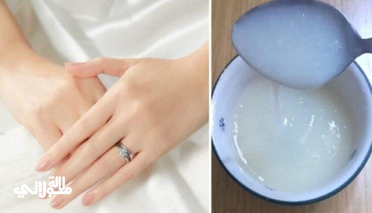 ستحتاجين إلى ملعقة كبيرة من الفازلين وملعقة كبيرة من النشا وملعقة كبيرة من ماء الورد بعدها اخلطي النشا مع ماء الورد وضعيهم على نار هادئة مع التحريك المستمر حتى تحصلي على خليط متجانس، أضيفي الفازلين إلى الخلطة وامزجيهم جيدا، ووزعي الخلطة على ظهر اليدين، وارتدي قفازات فوقها، يمكنك تطبيق هذه الوصفة قبل النوم وتركها طوال الليل، أو الاكتفاء بساعة واحدة، قومي بعمل الخلطة لمدة أسبوع واحد وستصبح بشرة يديك ناعمة وفاتحة.
