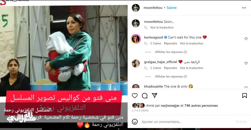 وتقاسمت فتو مع جمهورها عبر حسابها الشخصي على تطبيق “انستغرام”، صورة من كواليس تصوير إحدى المشاهد الخاصة بالمسلسل، أرفقتها بتعليق كتبت فيه: “قريبا”.