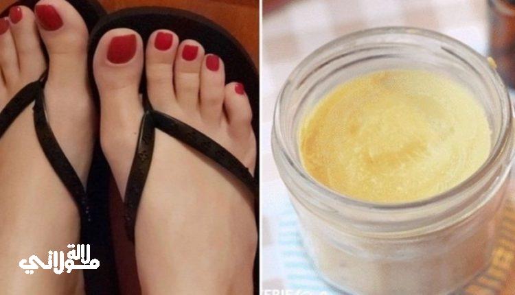 قومي سيدتي بخلط ملعقة من الحمص المطحون وملعقة من الفول المطحون وملعقة من بيكاربونات الصودا وأضيفي لها ماء الورد لخلط المكونات أو عصير الليمون ثم ضعي الخلطة على اقدامك واتركيها إلى أن تجف تماما مع ارتداء الجوارب بعد ارتداء كيسا بلاستيكيا وبعدها اشطفي وافركي جيدا اقدامك سترين النتيجة من أول استعمال .