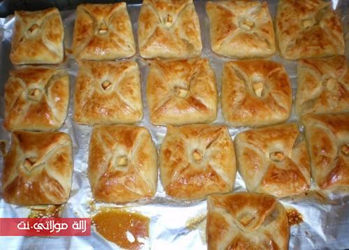 رغيفات تفاح نحتاج نص كيلو فورص لملح لماء دفاء ونعجن نتر ك لعين ترتاح شويا لحشوة كيلو تفاح مغسول مقشر مقطع صغير نضعة فى مقلة على نار مهيلة معا اضافة سكر حسب دوق واحد قانى وملقة كبيرة زبدة معا تحرك حتى يصير عجين تفاح ونتركة جانبا يبرد ناخد لعجين نعمل كويراة صغار نورق بزبدة ةتكون لعجينة رقيقة ونطوى على شكل مربع حتى تكمل لعجينة وناخد تفاح ونعمرو رغايف ونجمع لجوانب ونعمل عليهم لوزة من فوق وندهن بزبدة والى لفرن طيب عادى بصحة نتمنا تجربها بصحة ولعافية