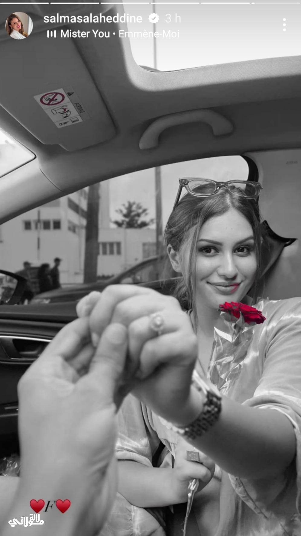 ونشرت سلمى صلاح الدين صورة لها رفقة خطيبها داخل السيارة حيث ظهرت في الصورة وهي تمسك يده وتضع خاتم الخطوبة وتمسك بوردة حمراء، معبرة عن سعادتها وفرحتها التي تقاسمتها مع متابعيها عبر السوشال ميديا.