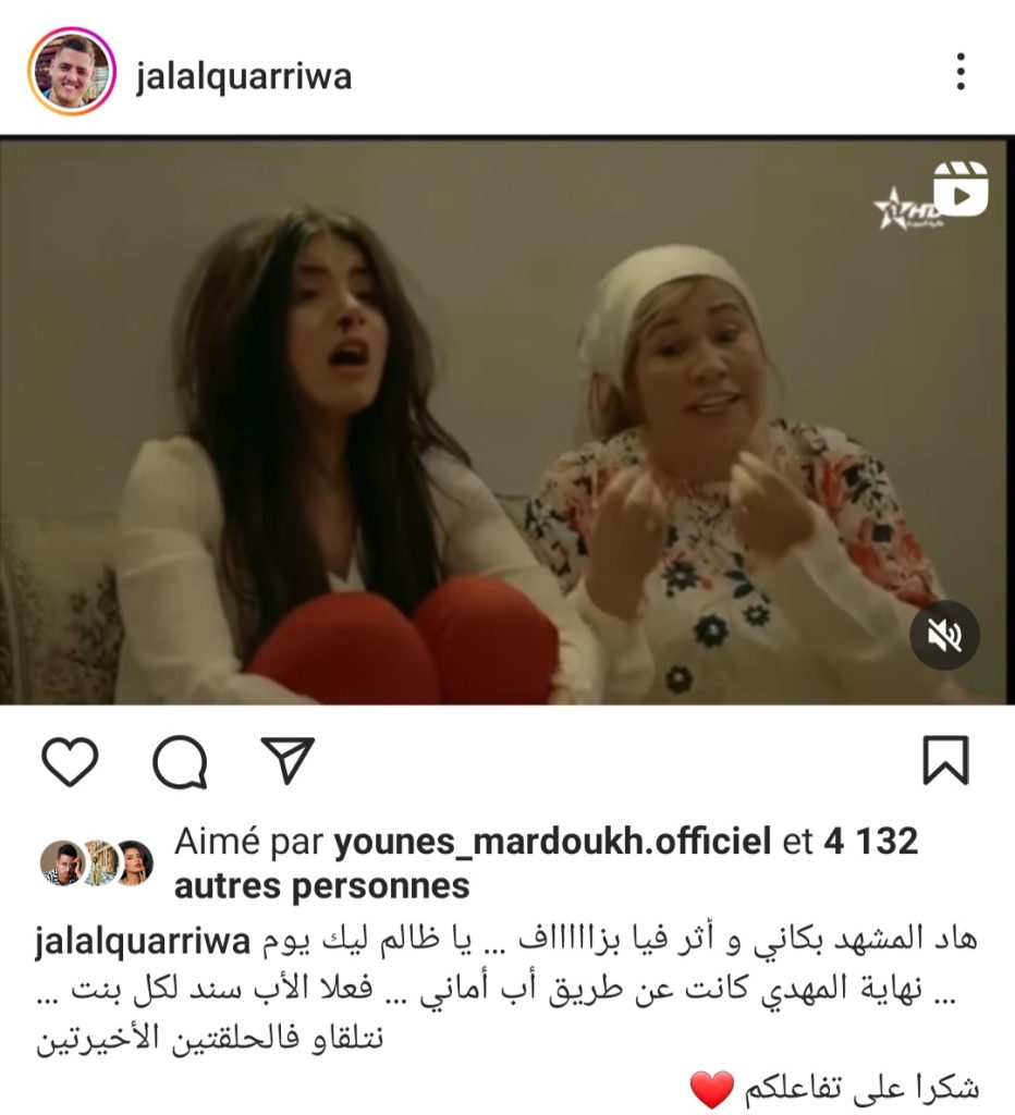 وشارك قريوا عبر حسابه الرسمي بموقع تبادل الصور والفيديوهات “انستغرام”، مقطع فيديو مقتطف من السلسلة، معبرا عن تأثره بهذا المشهد الدرامي حيث كتب: “هاد المشهد بكاني وأثر فيا بزااااف.. يا ظالم ليك يوم.. نهاية المهدي كانت عن طريق أب أماني.. فعلا الأب سند لكل بنت.. نتلاقاو فالحلقتين الأخيرتين”.