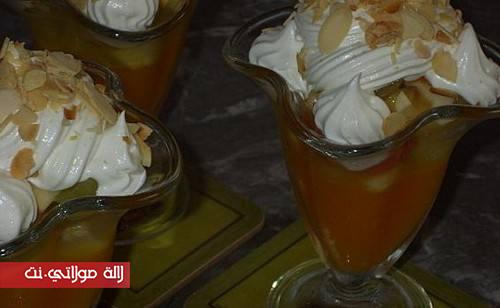 ناخدوا فواكه مشكلة اجاص- عنب _ موز خوخ ….. نقطعوها و نعصوا عليها نصف حامضة و 1 معلقة كبيرة السكر و نخلط و نعملوا الفواكه في الكيسان فوق الفلان بعدما عقد و نزوقوهم بلاكريم شانتيي و اللوز ايفيلي ثم الى الثلاجة حتى يبرد مزيااااان