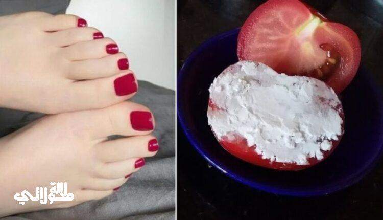 قومي سيدتي بخلط كمية من لب الطماطم المطحون وملعقة من بيكاربونات الصودا وملعقة من العسل وأضيفي لها ملعقة من الملح واخلطي جيدا المكونات ثم طبقيهم على اقدامك واتركي الخلطة مدة 30 دقيقة بعدها افركي اقدامك مدة 10 دقائق بعدها اشطفي بالماء ستلاحظين الفرق من أول مرة.