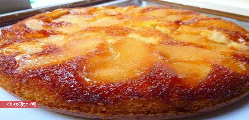 – يُسكَب المزيج بالملعقة في قالب التارت المُعدّ مسبقًا. يُوضَع الإجاص المقسّم إلى قسمَين فوق المزيج ويُرَصّ قليلاً داخله.