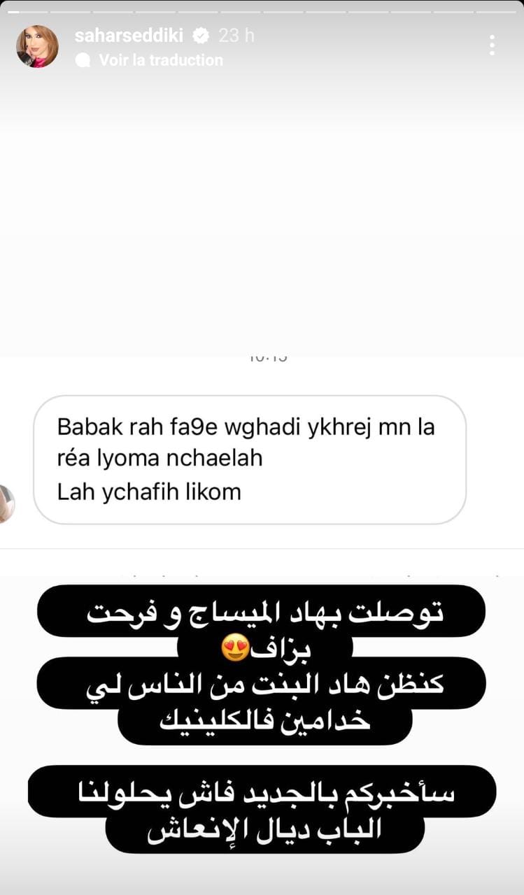 ونشرت سحر الصديقي رسالة توصلت بها من احدى المتابعات التي اخبرتها في الرسالة ان والدها تجاوز مرحلة الخطر وقد استيقظ اخيرا.