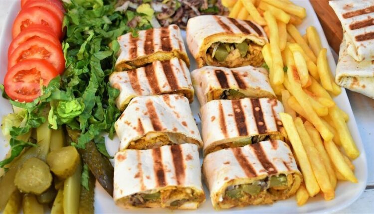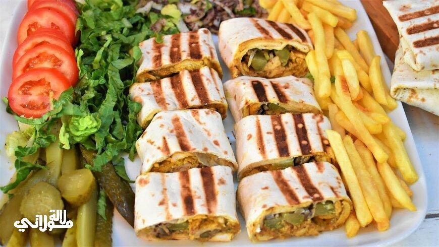 بعد ذلك تقدم الشاورما اليوناني مع سلطة الطحينة والبطاطس المحمرة.