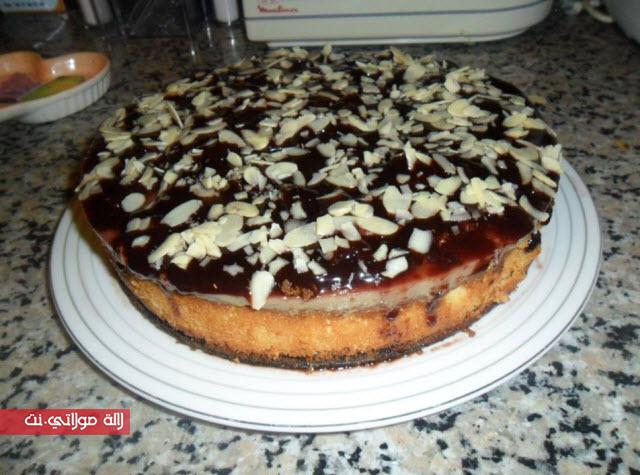 لي فيها كاس كبير ماء+سكر+فلان ديال الشكلاط نوضع كلشي فوق النار حتى يغلى نخليه يبرد شوية ونخويه فوق الطبقة التانية ديال الكريم باتسيير وندخلها للثلاجة حتى تبرد مزيان وتشد راسها ثم نزينها باللوز ايفلي