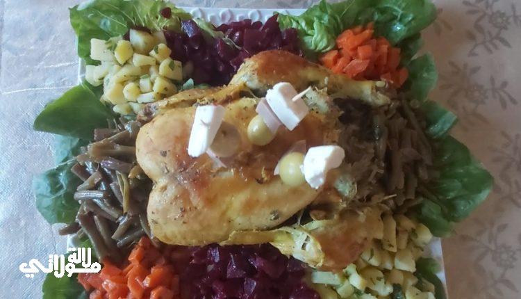 مقادير الخضر المرافقة:3 حبات بطاطس مبخرة+4 حبات جزر مبخرة+كمية من الفاصوليا الخضراء مبخرة+2 ملاعق كبيرة قزبرة ومعدنوس مفرومين+فص ثوم مفروم+زيت الزيتون+التوابل: فلفل أسود – فلفل أحمر – كمون+ملح.