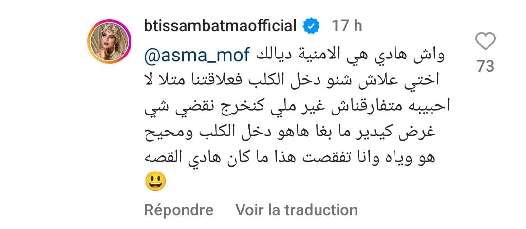 الا ان ابتسام بطمة خرجت عن صمتها لترد عن المتابعة قائلة في تعليق لها واش هادي هي الأمنية ديالك أختي، علاش شنو دخل الكلب فعلاقتنا، لا أحبيبة ماتفرقناش”.