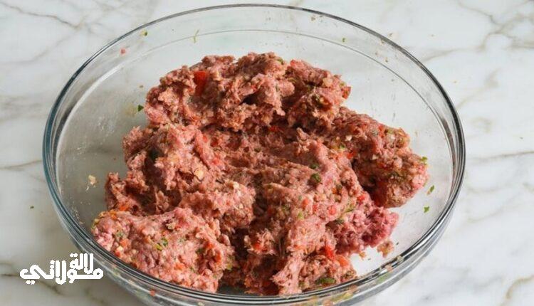 المكونات: ½ كيلو (500 جم) لحم بقري مفروم. ملعقة صغيرة (5 جم) مسحوق بصل. ملعقة صغيرة (5 جم) ملح. 2 ملعقة صغيرة (10 جم) أوراق زعتر مجففة. ½ ملعقة صغيرة (5 جم) فلفل. رشة قرفة.