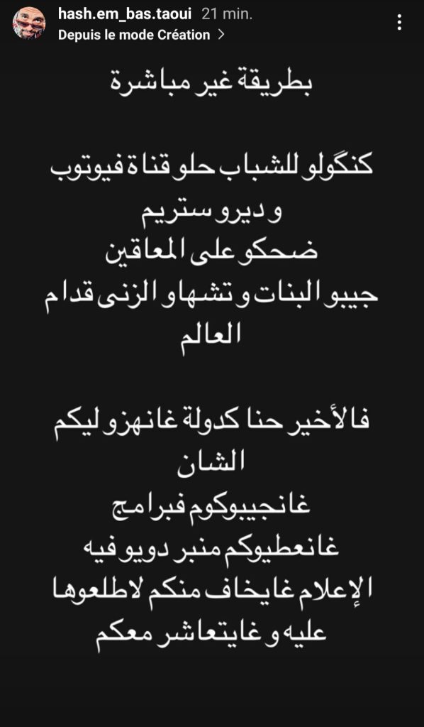 هذا وأضاف قائلا عبر خاصية القصص القصيرة:” بطريقة غير مباشرة كنقولو للشباب حلو قناة فيوتوب وديرو ستريم ضحكو على المعاقين جيبو البنات وتشهاو الزنى قدام العالم”.
