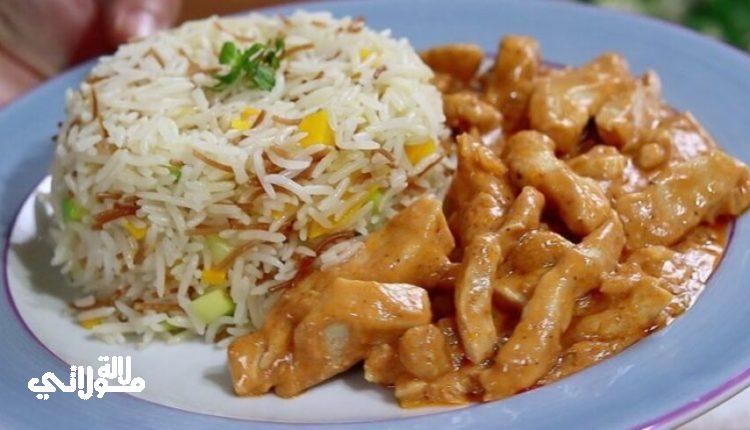 المكونات 3 صدور دجاج = 650 جرام 3 ملعقة كبيرة زيت 2 ملعقة كبيرة زبدة 1 بصلة صغيرة مفرومة ناعم 1 ونصف ملعقة كبيرة دقيق 1 ملعقة كبيرة معجون طماطم 1 كوب حليب 1 كوب مرق 1 ملعقة صغيرة ثوم باودر للتقديم ارز بشعيرية خضار مكعبات بصل ـ كوسا ـ فلفل الوان زيت نباتي.