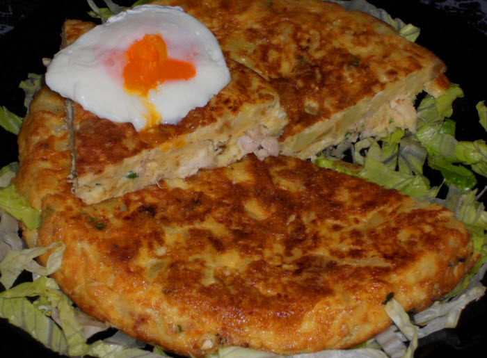 في مقلات جيده نضع القليل من الزيت نتركه يسخن على نار هادئة ثم نضيف نصف كمية خليط البطاطس بالبيض ننتظر قليلا الى ان يبدئ الخليط في التماسك نضيف فوقه قطع الدجاج بالثوم القصبي ثم الطبقة الثالثة من خليط البطاطس بالبيض المتبقي ننتظر قليلا ثم نقلبها على الجهة الاخرى بالاستعانة بصحن مسطح نتركها حتى تتماسك ونعيد الكرة مرة اخرى لتنضج من الداخل.