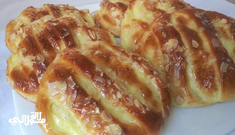 المكونات 300 غ دقيق بيضة 40 غ زبدة ملعقة كبيرة سكر ملعقة متوسطة خميرة الخبز ملح + فانيلا كاس الا ربع حليب الكريمة كاس ونصف حليب ملعقة كبيرة ونصف بودرة الكاسترد ملعقة كبيرة ونصف سكر للتزيين اصفر بيضة + حليب+خل لوز ايفيلي ناباج او مربى.