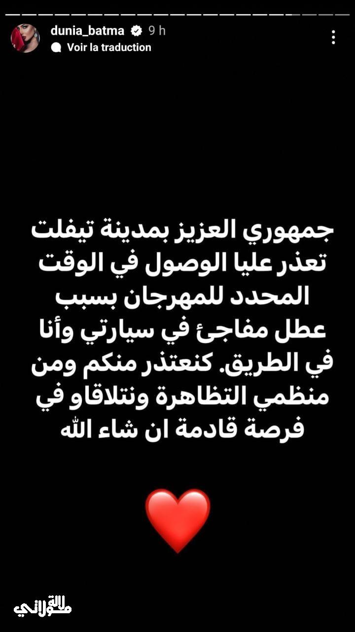 وكتبت الفنانة دنيا بطمة التي نشرتها كاعتذار للجمهور قائلة:”اعنذار لجمهورها جاء فيه مايلي: “جمهوري العزيز بمدينة تيفلت تعذر عليا الوصول في الوقت المحدد بسبب عطل مفاجئ في سيارتي وأنا في الطريق”.