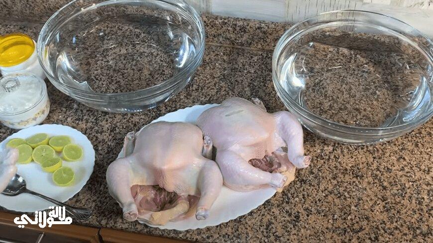 في البداية نقوم بشطف الفرخة بشكل جيد تحت الماء الجاري، ونحاول قدر الإمكان التخلص من المادة اللزجة المتواجدة بين اللحم والجلد.