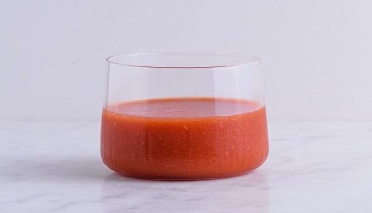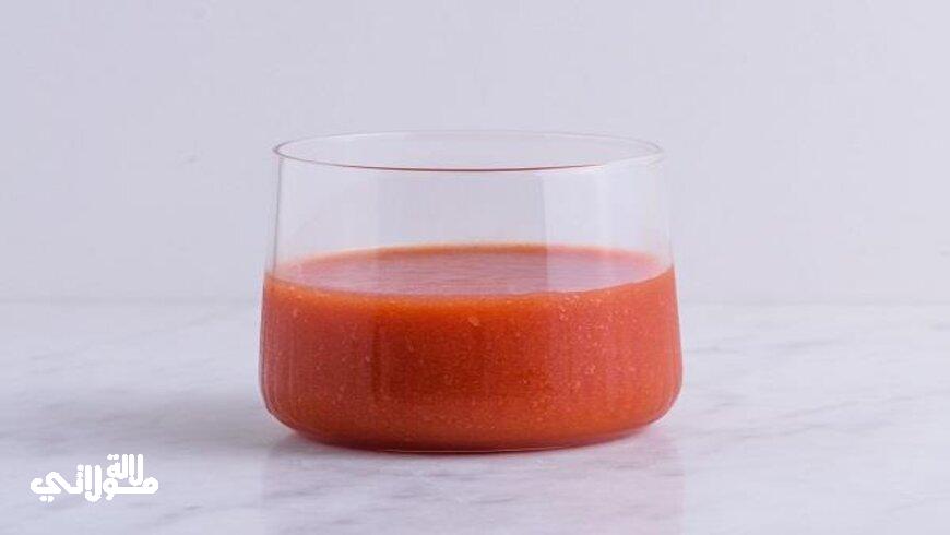 المكونات : حبتين من الطماطم + حبة من الخيار + عودين من الكرفس + نصف كوب من عصير الليمون + قطعة طرية من الزنجبيل + عصير البرتقال + ملعقة من العسل الطبيعي + ملعقة من الزبيب