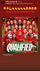 و على إيقاعات أغنية “ديرو النية” ، نشر الركراكي على خاصية “سطوري” بحسابه الشخصي بإنستغرام تهنئة للبؤات الأطلس عبارة عن صورة أرفقها بتصفيقات حارة وراية المغرب.