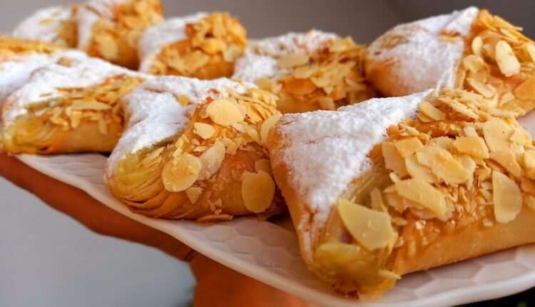 المكونات العجين : 400 غ دقيق الفورص + 100 غ دقيق الفينو + م ص ملح + م ك سكر + ماء الحشوة كريم باتسيير للتزيين : مربى + لوز.