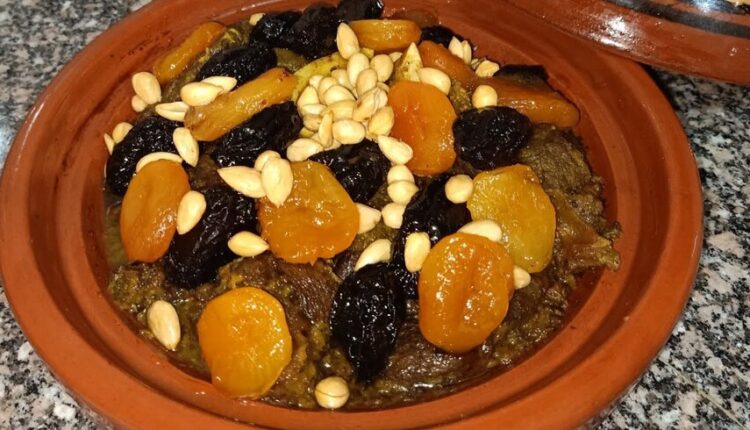 المقادير: كيلو (1000 جم) لحم مقطع مكعبات كبيرة+ 2 ثمرة بصل متوسطة الحجم مفرومة ناعما+ 4 فصوص ثوم مهروس+ 2 كوب (500 مل) ماء مغلي+ ¼ 1 كوب (250 جم) برقوق+ ½ كوب (100 جم) لوز مقشر ومحمص+ ¼ كوب (60 مل) زيت زيتون+ 2 ملعقة كبيرة (25 جم) سكر+ ملعقة كبيرة (12.5 جم) زبدة+ ملعقة كبيرة (12.5 جم) سمسم محمص+ ملعقة صغيرة (5 جم) زنجبيل+ملعقة صغيرة (5 جم) كركم+ ½ ملعقة صغيرة (2.5 جم) قرفة مطحونة+ ¼ ملعقة صغيرة (1.25 جم) زعفران+ 2 عود قرفة+ملح وفلفل أسود.