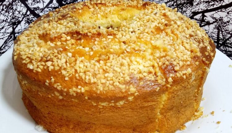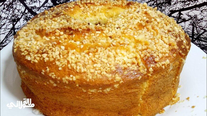 واستمري في الخفق لمدة دقيقتين. أضيفي خليط الدقيق تدريجيًّا، واستمري في الخفق حتى يذوب الدقيق تمامًا. صبي العجين في صينية مدهونة بالقليل من الزيت، ومرشوشة بالدقيق. وزعي اللوز المقشر على وجه العجين دون تقليب. ضعي الكيك في الفرن لمدة 45-50 دقيقة، ثم أخرجيه، واتركيه يبرد قليلًا قبل تقديمه.