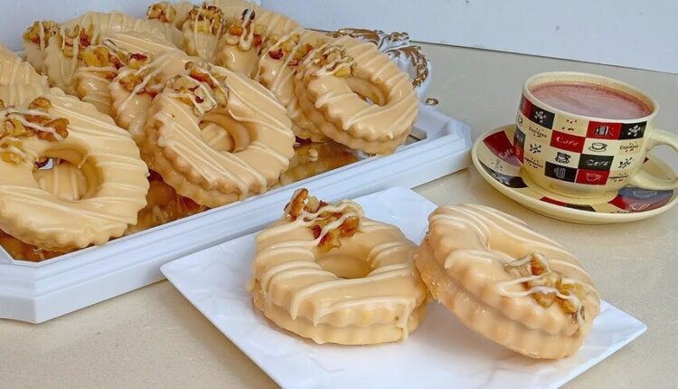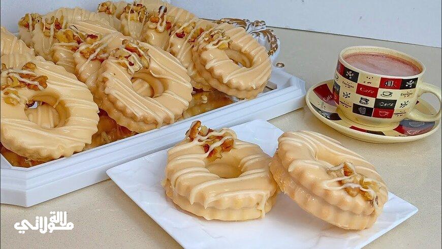 المكونات : 3 بيضات 120 غ سكر 150 مل زيت 500 غ دقيق فانيلا 16 غ خميرة الحلويات رشة ملح للتزيين شوكولا بيضاء ملعقة كبيرة من الكراميل او نيسلي كراميل.